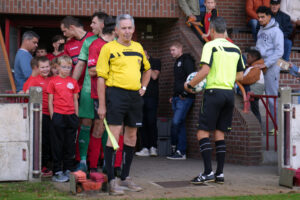 Fonny (links met vlag)Omdat 1 van de assistent-scheidsrechters bij de wedstrijd KFC Hamont 99A – THES B niet kwam opdagen, werd er een vervanger gezocht. Stadionomroeper Fonny Plessers (nog steeds actief als ref, en vroeger internationaal assistent-scheidsrechter) nam deze taak op zich, en deed dat uitstekend. We hadden niet anders verwacht. 🙂
