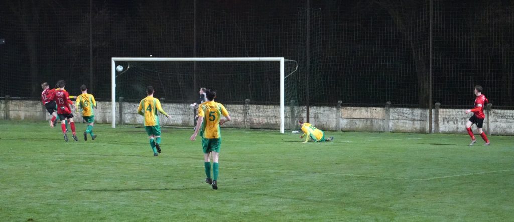 Overbuurman Jarne Stelten had een rustige avond onder de lat. Bij een vrije trap van de bezoekers kon hij na een luchtduel de bal niet klemmen, de afvallende bal ging via een KFC-er in corner. Aan de overzijde werd een afgeweken bal van Witze Hellings ternauwernood in corner gebokst. Xante Croymans en Kevin van den Akker besloten nog naast doel … het bleef zo onnodig spannend. Tot op een kwartier van het einde de ban gebroken werd: verdediger Lemmens verwerkte een strakke voorzet van Kevin van den Akker in eigen doel: 0-1. In de absolute slotfase lanceerde de ingevallen Sjors van Eck middenvelder Dries Damen. Diens voorzet werd aan de tweede paal onhoudbaar in de winkelhaak gevlamd door de eveneens ingevallen Kobe Alen. [UPDATE] Blijkbaar werd de bal in de kruising gejaagd door Viallatte, een tweede own-goal in deze wedstrijd.